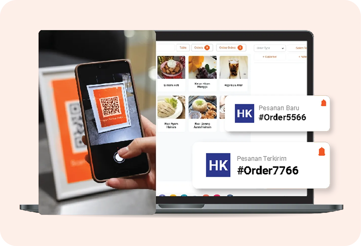 Pelanggan scan QR di meja → pilih menu → bayar → pesanan langsung masuk ke dapur.